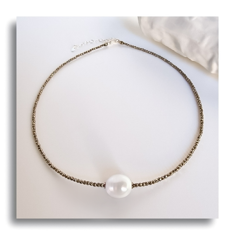 Il Girocollo con Perla Bianca barocca, è realizzato interamente a mano con montatura in Ematite/Pirite e Argento 925.