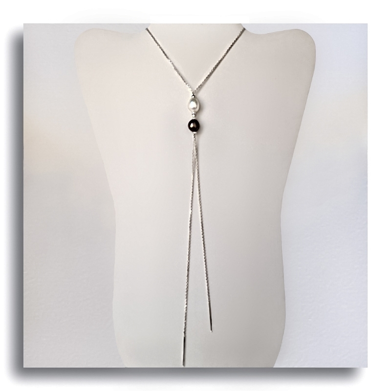 La Collana lunga con doppia Perla, una Bianca e una Nera, è realizzata interamente a mano con montatura in Argento 925 placcato oro rosa 18kt.