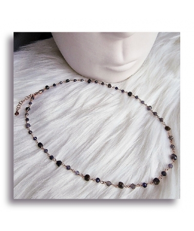 Il Girocollo in Iolite è realizzato interamente a mano, con la preziosa tecnica di montatura a 'Rosarietto' in Argento 925 placcato Oro Rosa.
