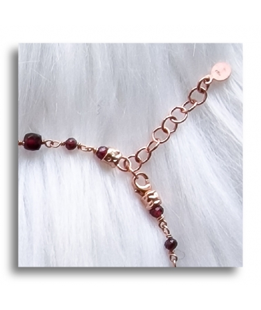 La Collana con Granato naturale è realizzata interamente a mano con la preziosa tecnica orafa di montatura a 'Rosarietto', in Argento 925 placcato Oro Rosa.